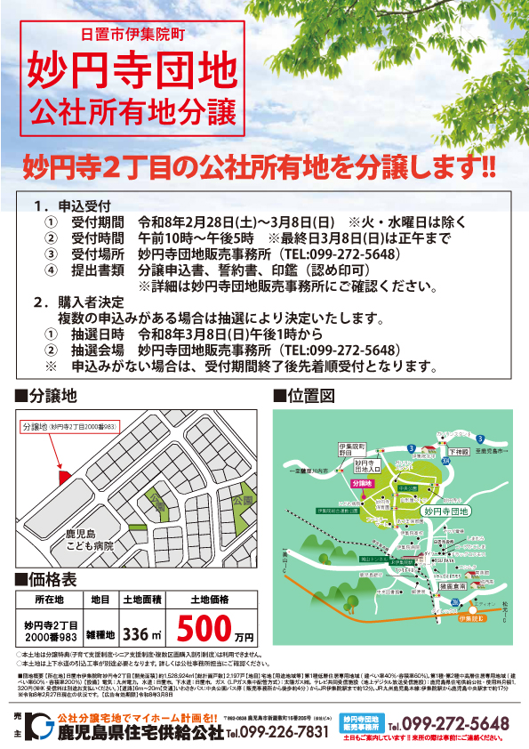 妙円寺団地公社有地の分譲のご案内(その1) ※売約済につき終了 2026.02.27 【提出書類】 ①分譲申込書(PDF) ②誓約書(PDF) 【物件情報】 ①地積測量図(PDF) ②土地調書(PDF) « 【重要なお知らせ】当公社の代表者を名乗る不審なメールにご注意ください 一覧にもどる 妙円寺団地公社有地の分譲のご案内(その2) ※売約済につき終了 »